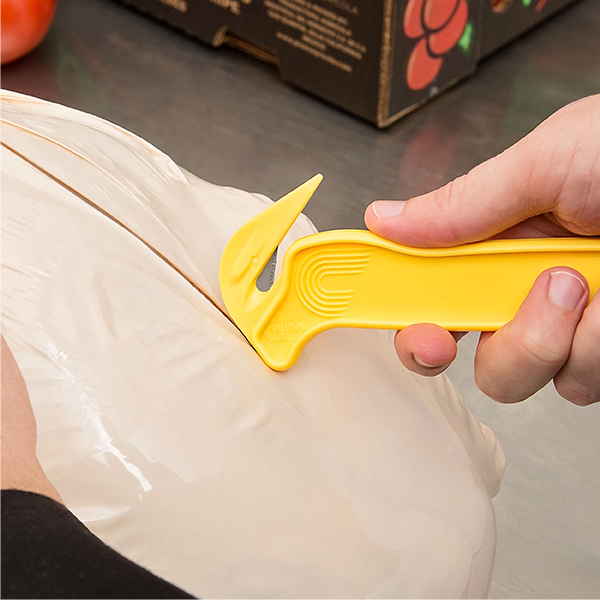 Easy to clean and sanitize, these safety cutters feature a stainless steel blade and are an ideal choice for cutting cryovac, plastic bags, shrink wrap, and paper bags.